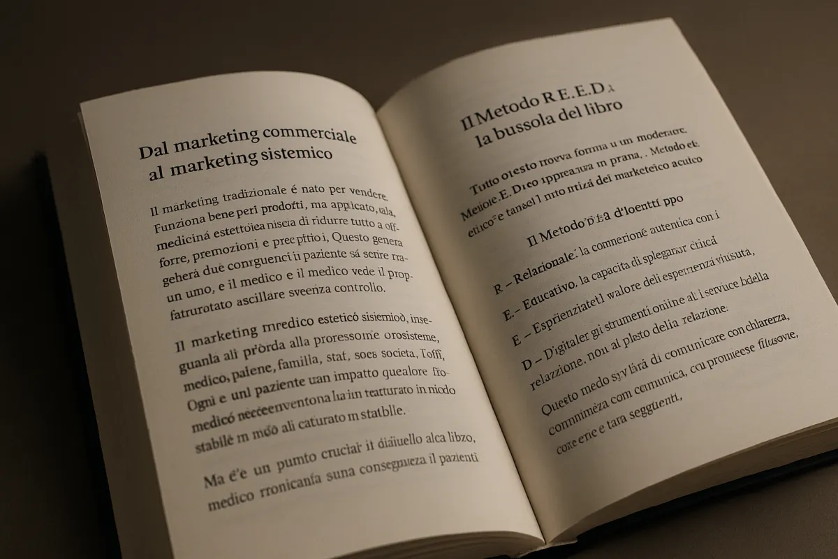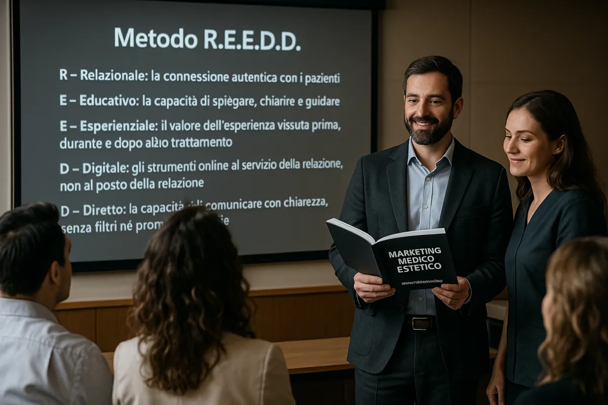 “Il Metodo R.E.E.D.D. rappresenta la svolta per il marketing medico estetico: Relazione, Educazione, Esperienza, Digitale e Risposta Diretta non sono concetti astratti, ma azioni concrete che ti permettono di comunicare chi sei con coerenza, guadagnare fiducia autentica, fidelizzare i pazienti giusti e trasformare il tuo studio in un punto di riferimento credibile e profittevole.”